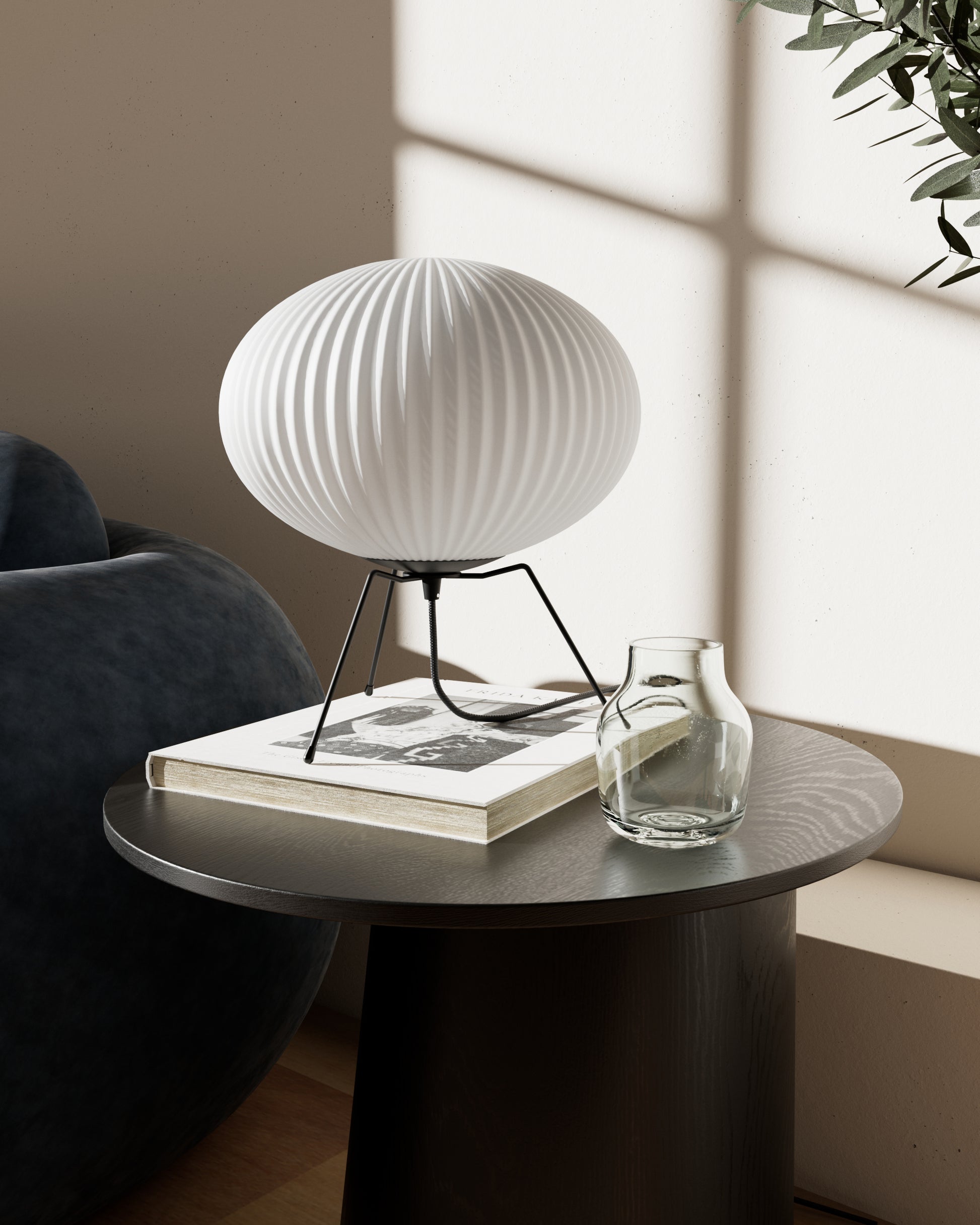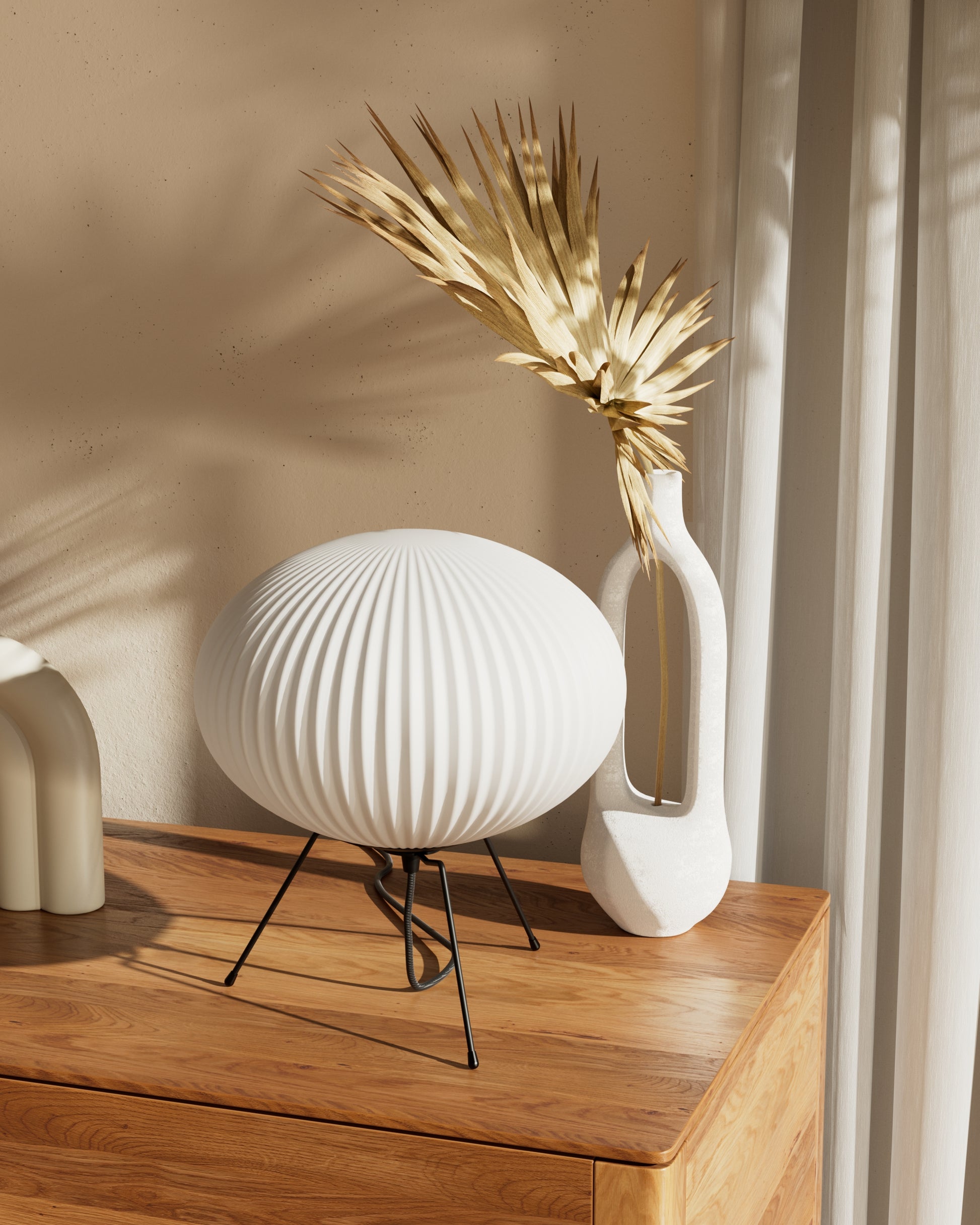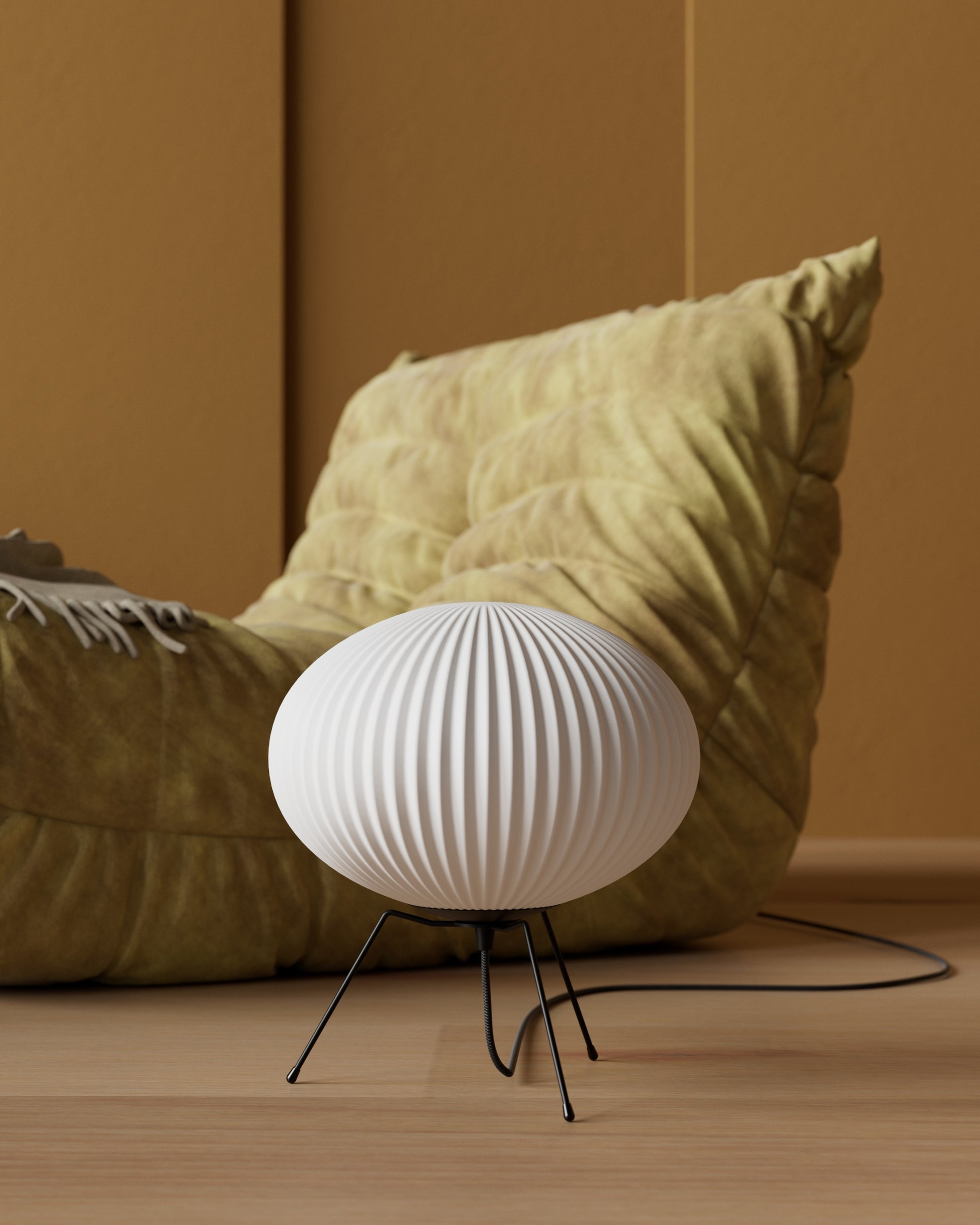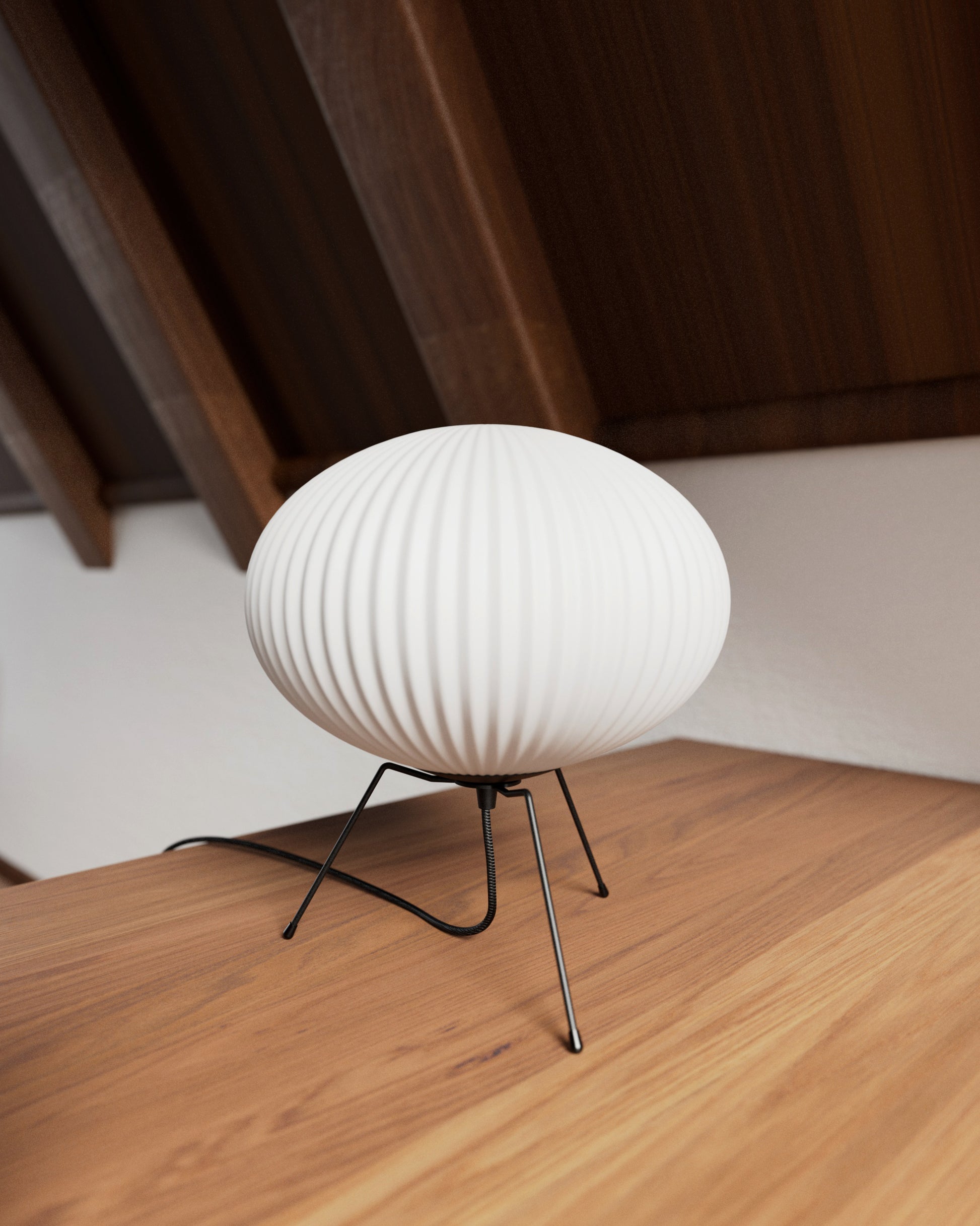 With its blown opaline shade, Nausicaa revisits the pleating that is so characteristic of the cellulose acetate of the Praying Mantis floor lamp.